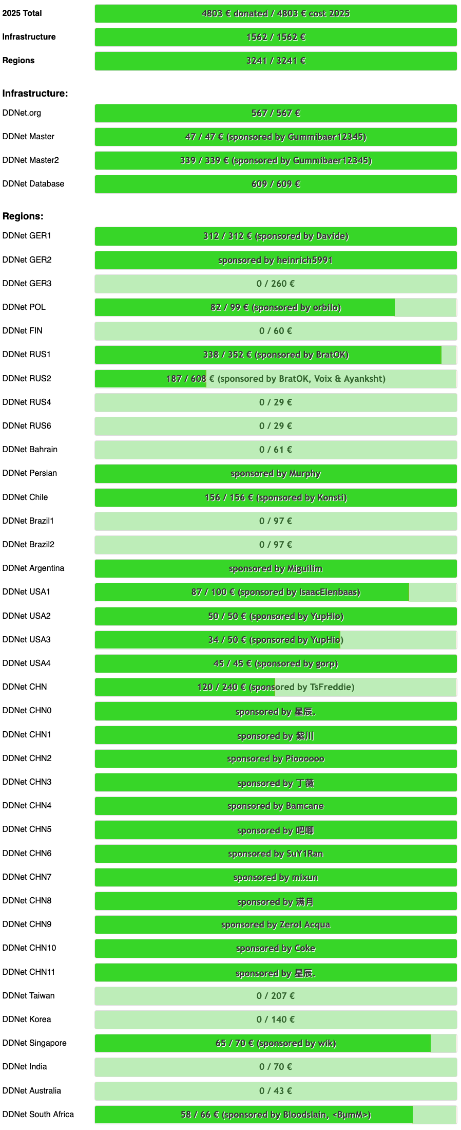 Thanks to all donors donating a total of 4803 € (including a huge donation of 1524 € by heinrich5991) and sponsoring servers DDNet is now fully funded until the end of 2025!